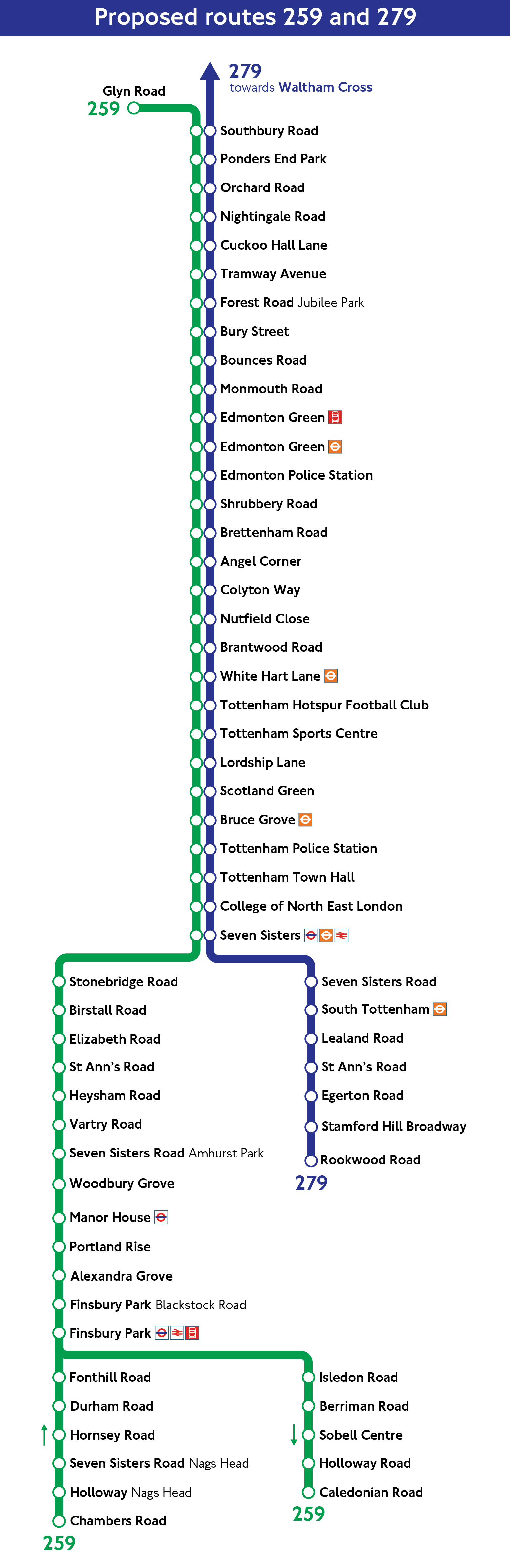 We are proposing to change the start and end of routes 259 and 279 and to withdraw route 349. Below is a map showing the proposals for routes 259, 279 and 349. Underneath the map you can find more details about the proposed changes.Current Route: Operates between Edmonton Green and King's Cross.