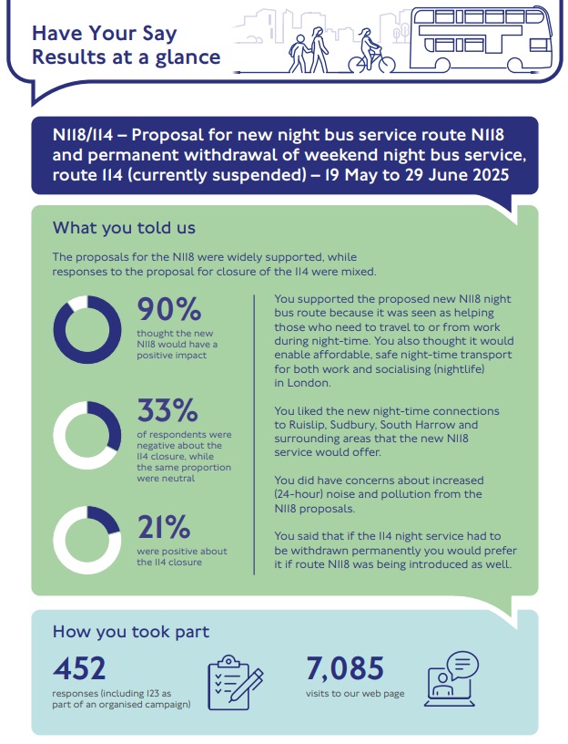 Between 19 May 2025 and 29 June 2025, we held a public consultation on proposals to create new night bus route N118 and make changes to the weekend-only night bus service on route 114.