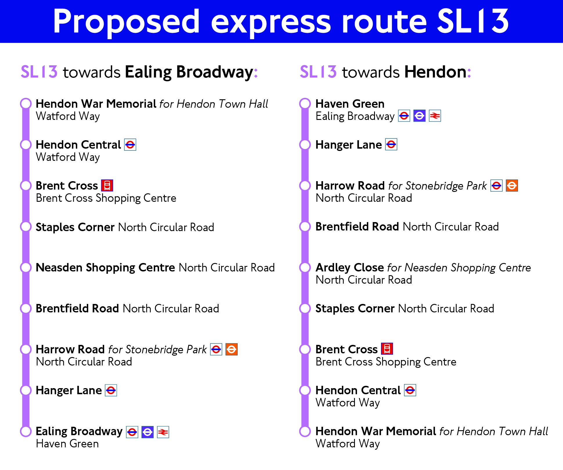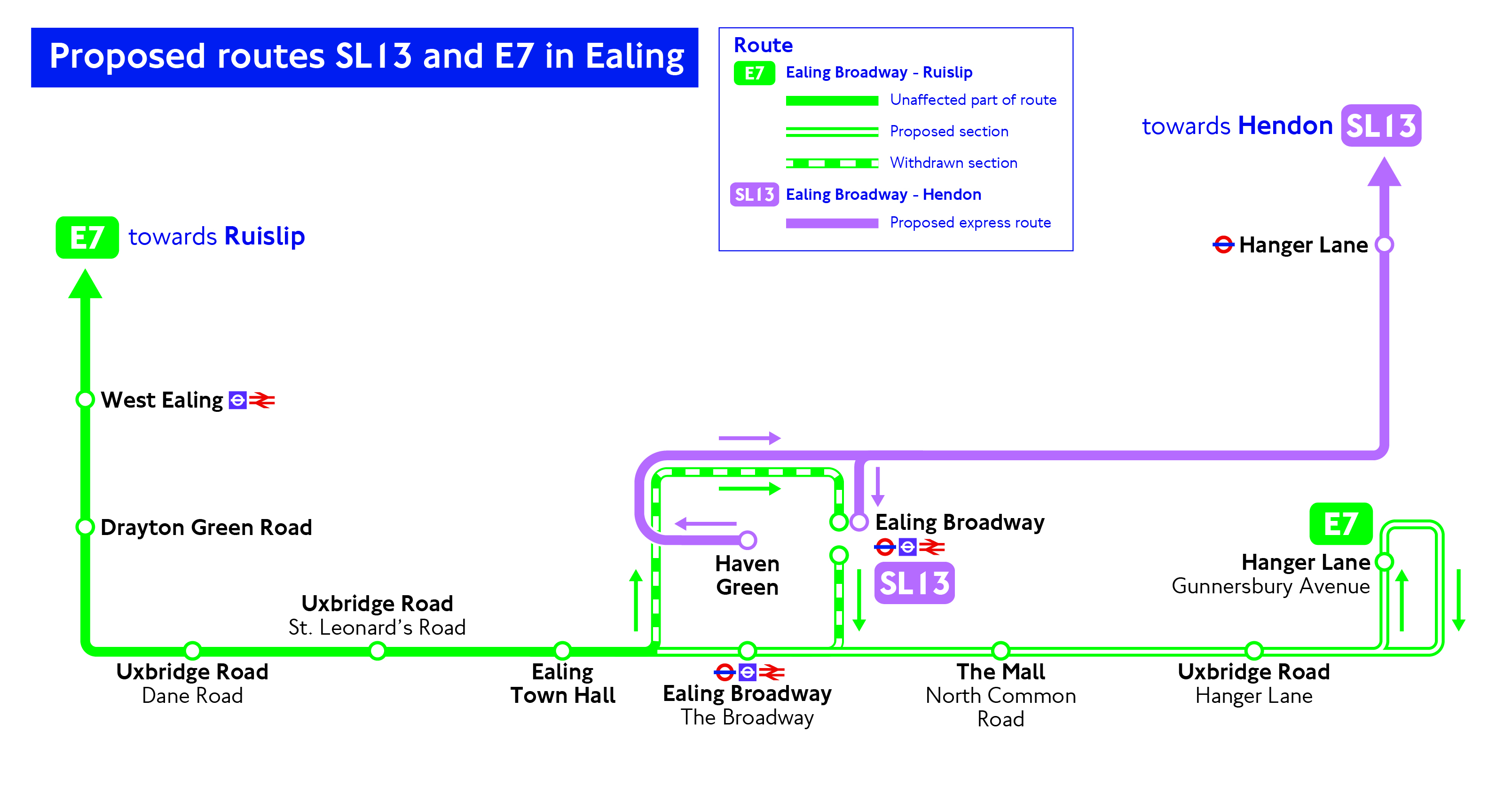 SL13 - proposed express bus service between Hendon and Ealing Broadway, with changes to route E7